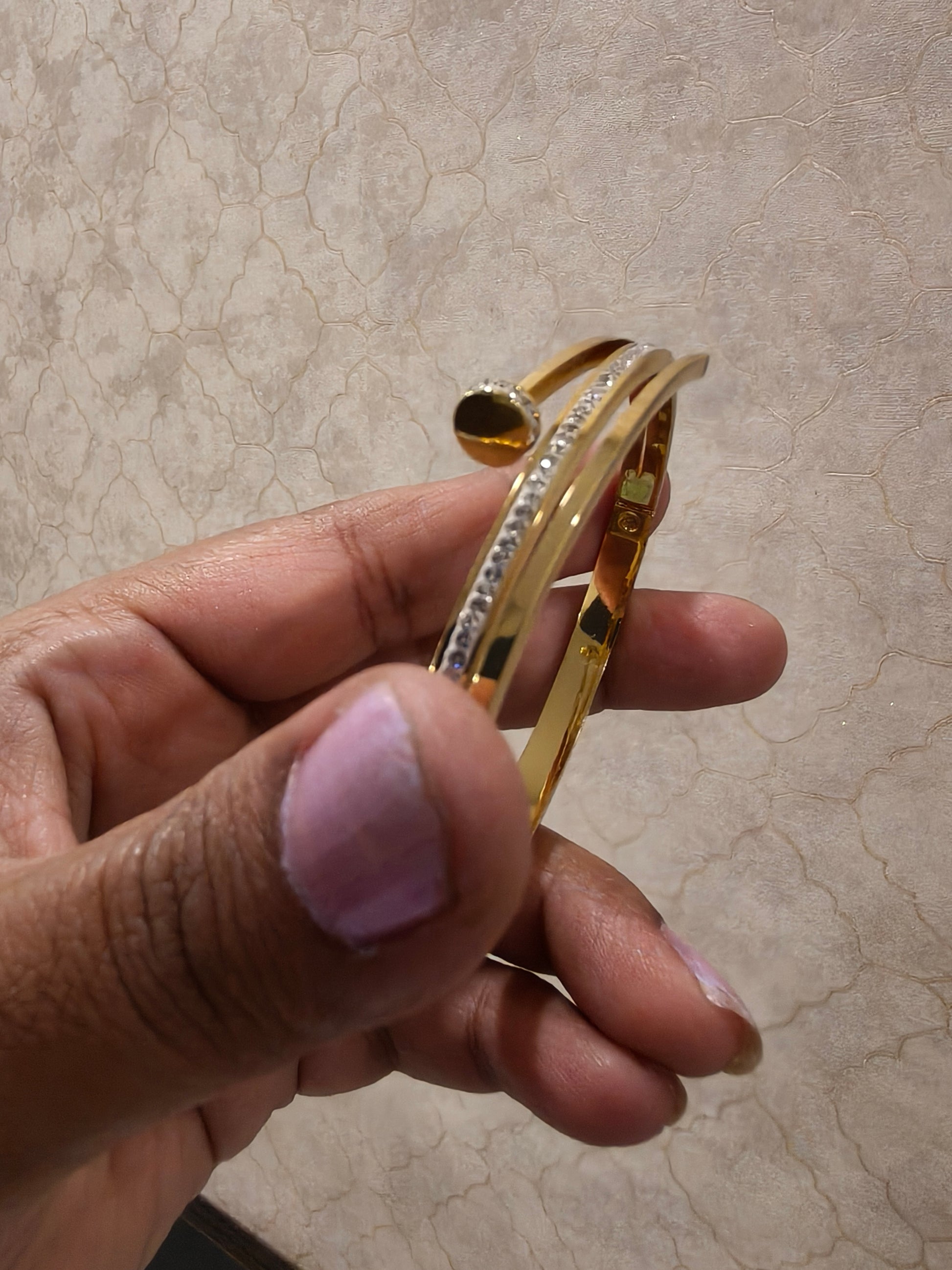 Gold-plated stainless steel openable bracelet with lots of AD stones and emerald stones studded.