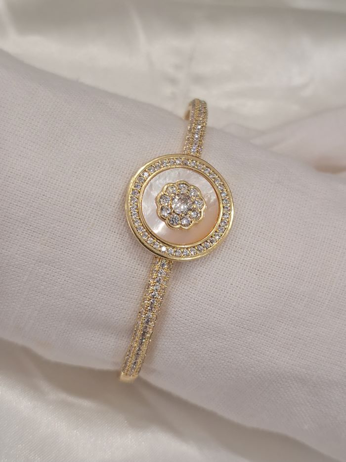 Gold-plated stainless steel openable bracelet with lots of AD stones and MOP at the centre.