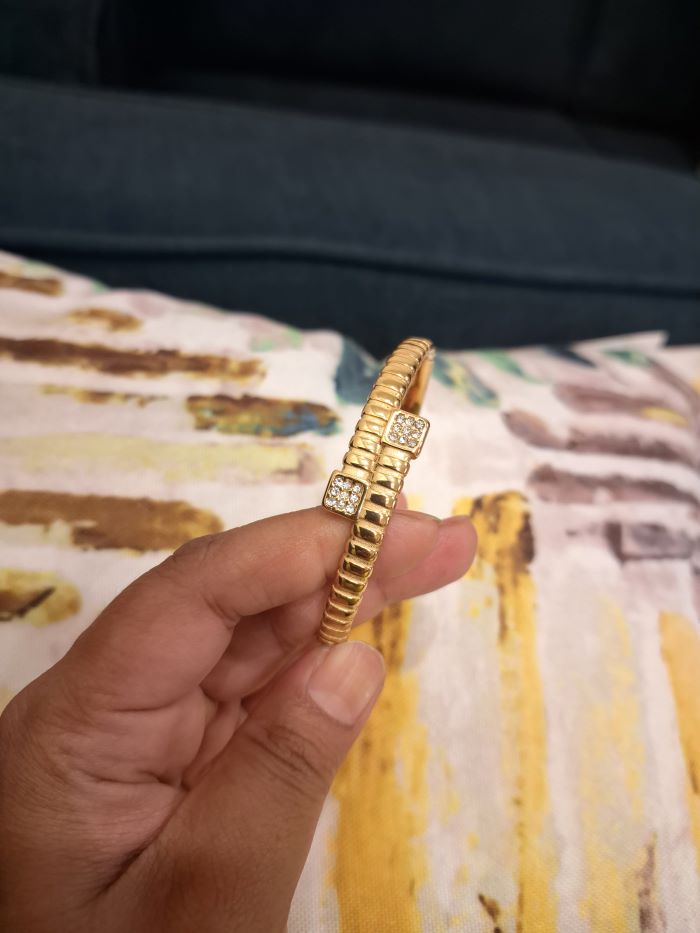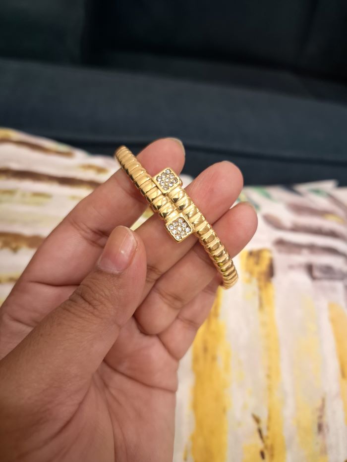 Stainless steel anti-tarnish kada or bracelet in handcuff style. The bracelet is studded with white AD stones and is free-size and openable.