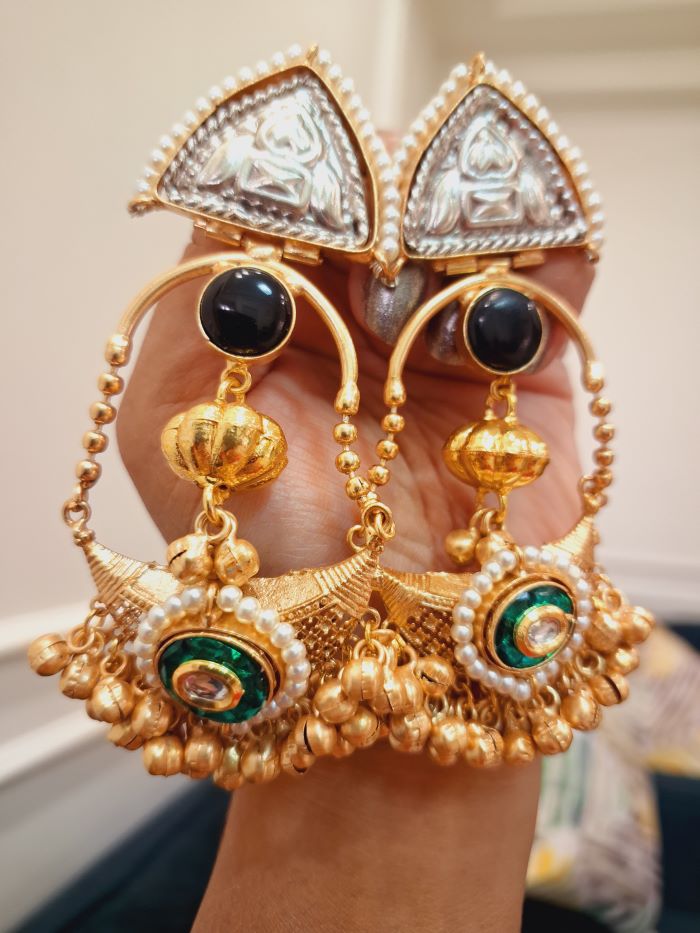 Dual tone brass chandbali earrings embellished with stones, kundan and ghungroos.