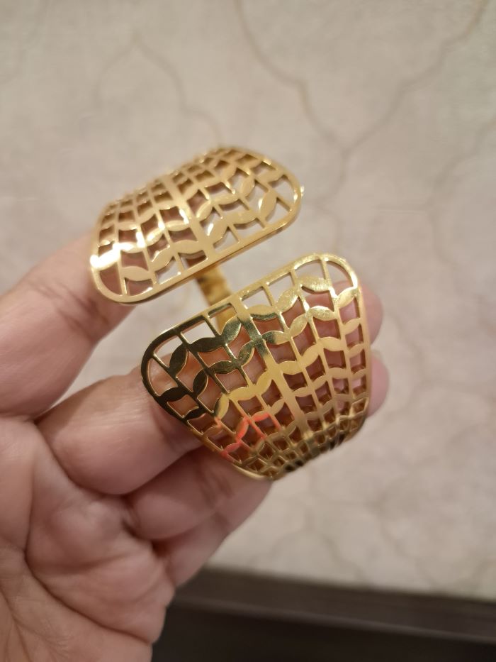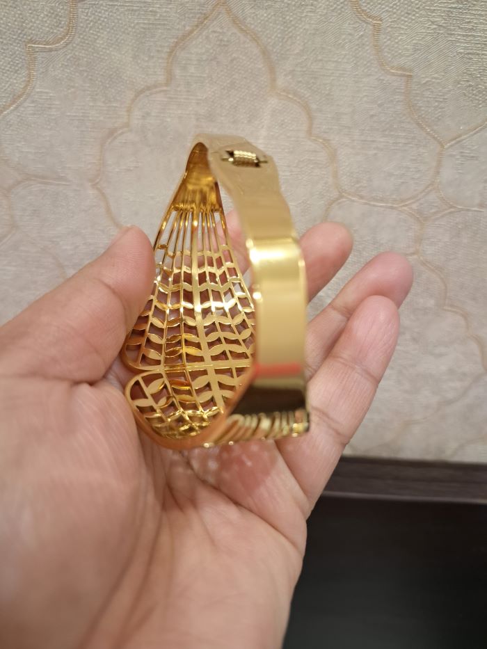 Stylish gold-platedsStainless steel floral design anti-tarnish kada or bracelet in handcuff style. The bracelet is free-size and openable.