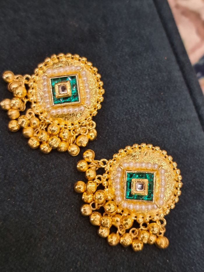 Light-weight gold-plated brass studs earrings with ghungroo and kundan embellishments.