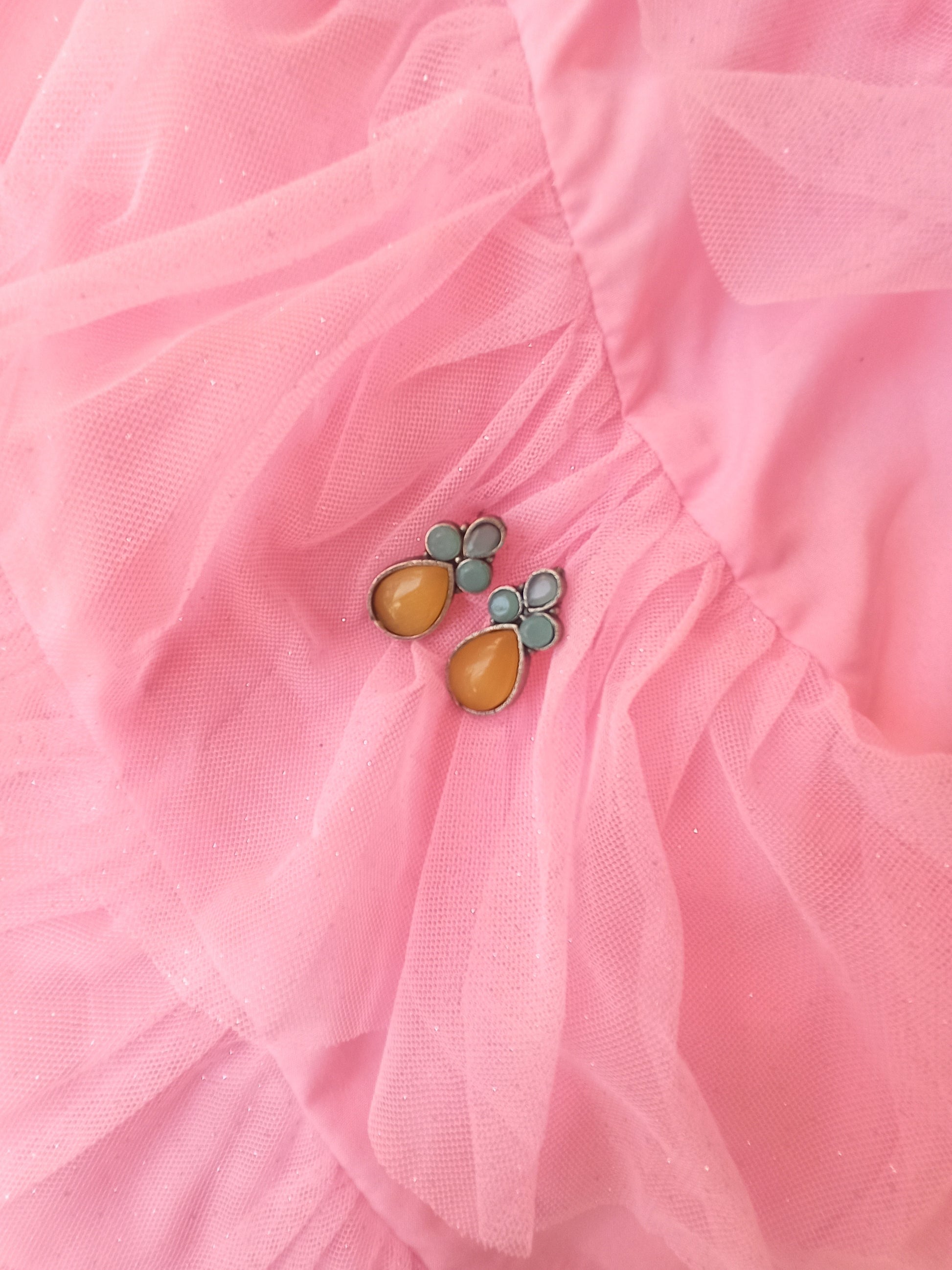 Small sized studs earrings with dual monalisa stones. The base metal is brass. The earrings design and pattern makes it suitable for pairing with both Indian and western outfits.