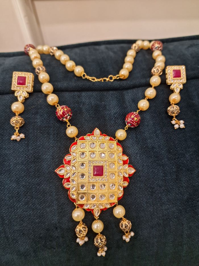 Pearl and kundan red jaipuri mala with matching earrings.