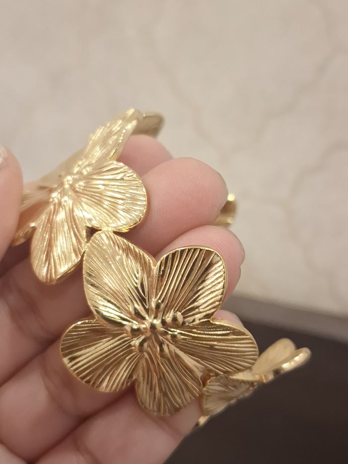 Stainless steel anti-tarnish bracelets or cuffs in golden flower design. These are wide stackable bangles that can also be worn singly.